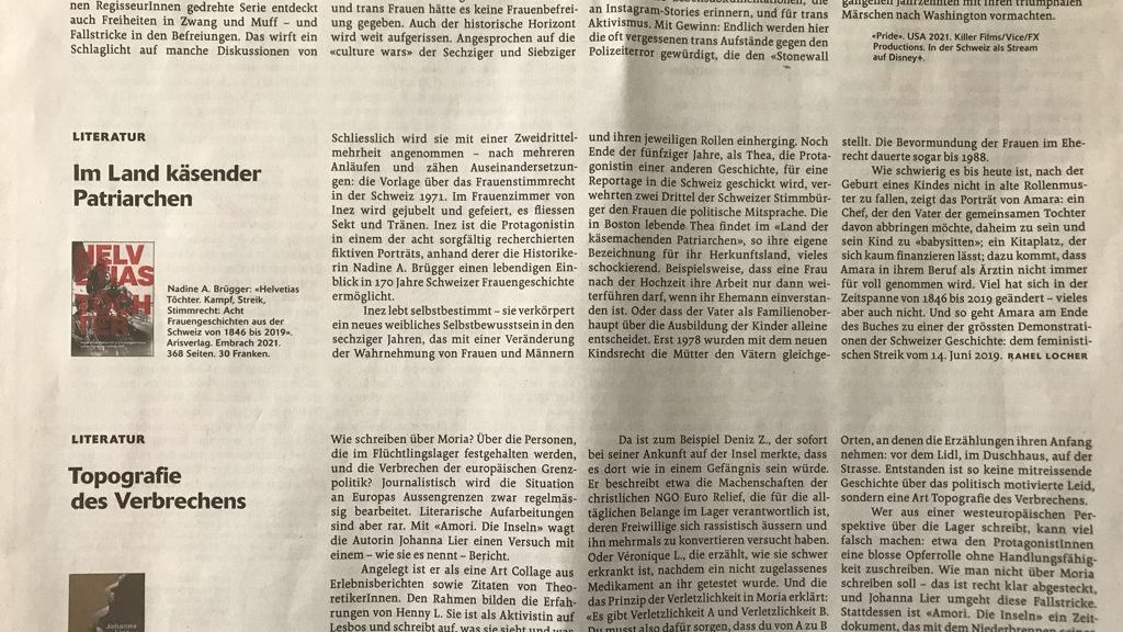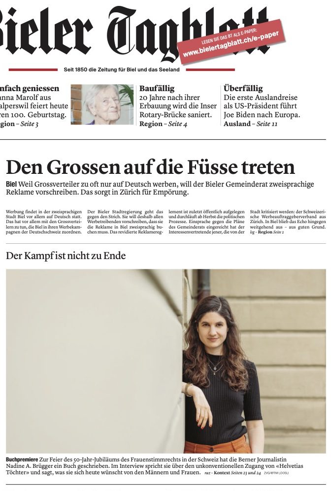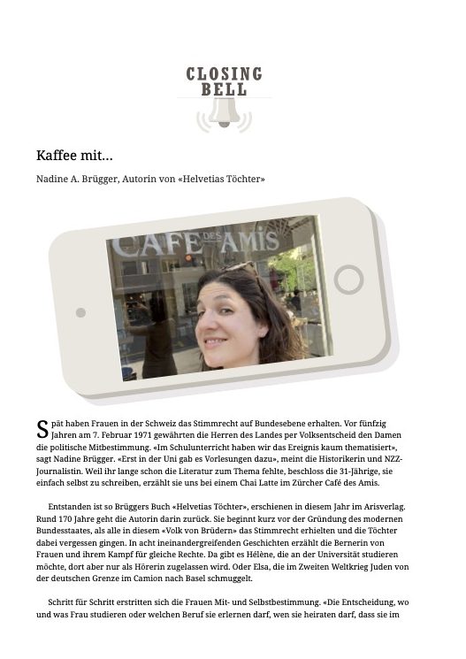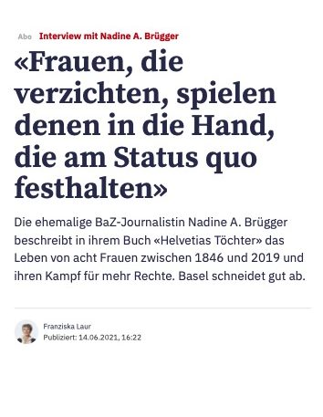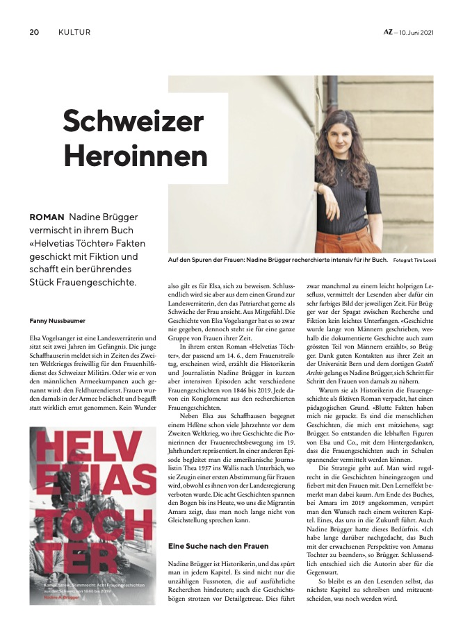 «Wer sich gerne in Geschichten verliert und dabei noch etwas lernen möchte, sollte das Buch «Helvetias Töchter» von Nadine A. Brügger lesen. Die Historikerin und Journalistin erzählt in acht kurzweiligen Geschichten, wie sich die Frauen in der Schweiz das Stimmrecht erkämpft haben.»